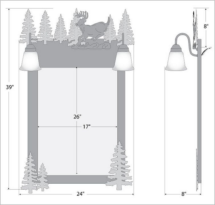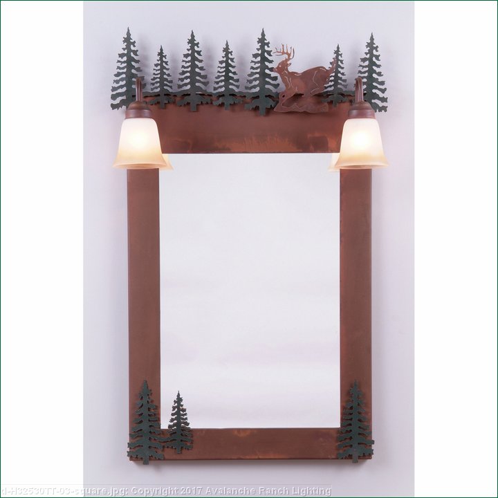 The Wasatch Mirror Frame with Lights - Mtn Deer features a deer with cedar trees. Here we have taken our popular Wasatch Bath light and added a mirror frame for use in the bathroom or entry-way. Offered with a choice of four different styles and colors of glass globes, this fixture gives abundant light and rustic character to any bathroom.