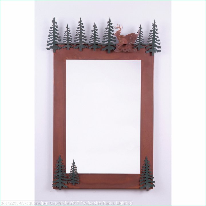 The Wasatch Vertical Mirror Frame - Mtn Deer features a deer with cedar trees. Here we have taken our popular Wasatch Bath Mirror and removed the lamping.