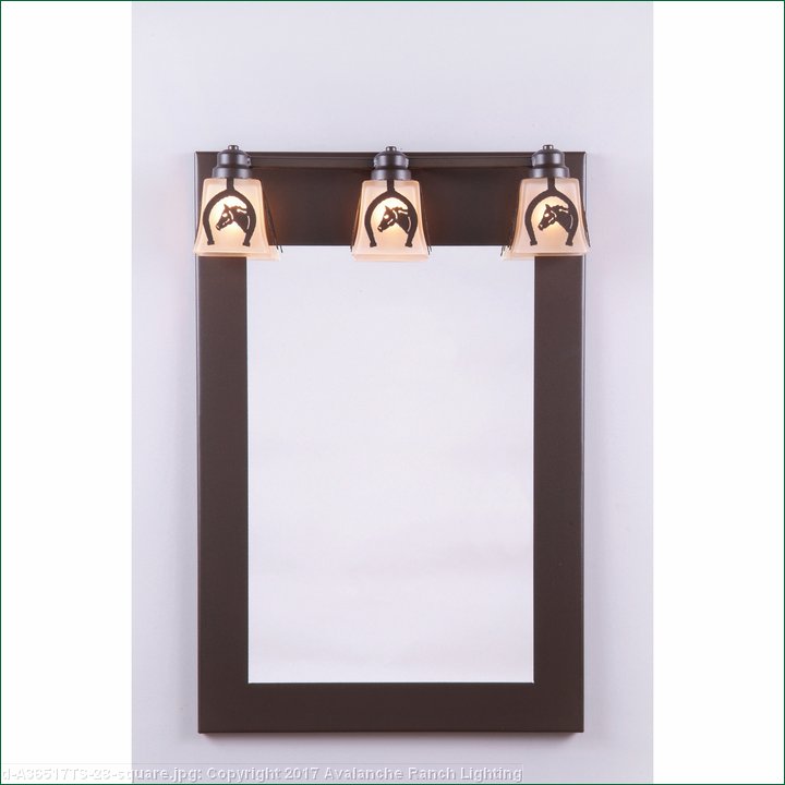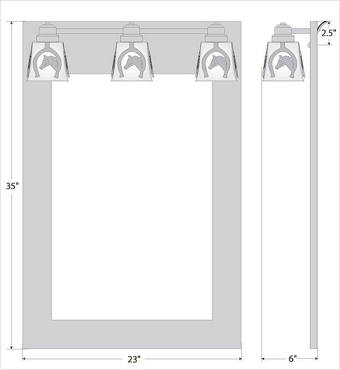 The Woodland Mirror Frame with Lights - Horse Horseshoe features a mirror frame and three pieces of square mission style glass and horse designs surrounding the glass. The horse head has hand-cut interior lines which gives each image a unique look. Choice of glass color between Frost Clear and Tea-Stained. The lighting provided by this item allows the mirror to be hung in even the dimmest areas of any home, while also creating a stylish rustic contemporary atmosphere.