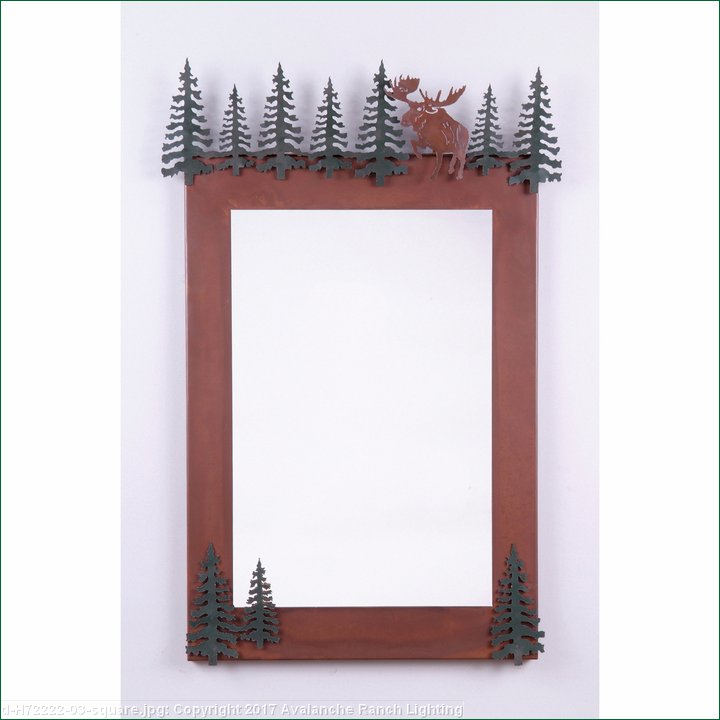 The Wasatch Vertical Mirror Frame - Alaska Moose features a moose with cedar trees. Here we have taken our popular Wasatch Bath Mirror and removed the lamping.