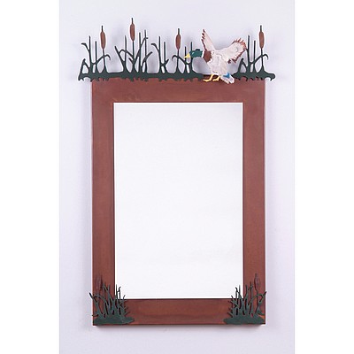 The Wasatch Vertical Mirror Frame - Mallard features a handpainted duck landing in a whole bunch of metal cattails. Here we have taken our popular Wasatch Bath Mirror and removed the lamping.