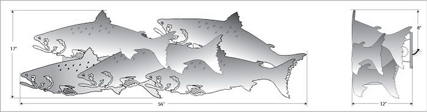 At 5 feet wide, this is our largest sconce. The Big Fish Chinook Salmon Sconce features our unique seven-step hand-painted finishing process. The color and layering of the fish add a lifelike characteristic that gives the effect of the fish swimming amongst one another. Behind the fish is a frost clear diffuser covering the sockets to shield the bulb from top and bottom viewing. Imagine this sconce hanging on your rock fireplace or when you are looking to bring unique rustic lighting to the walls of your log home, cabin or northwood lodge-themed room..