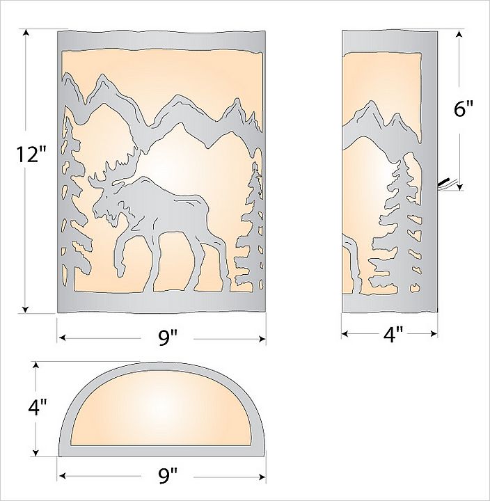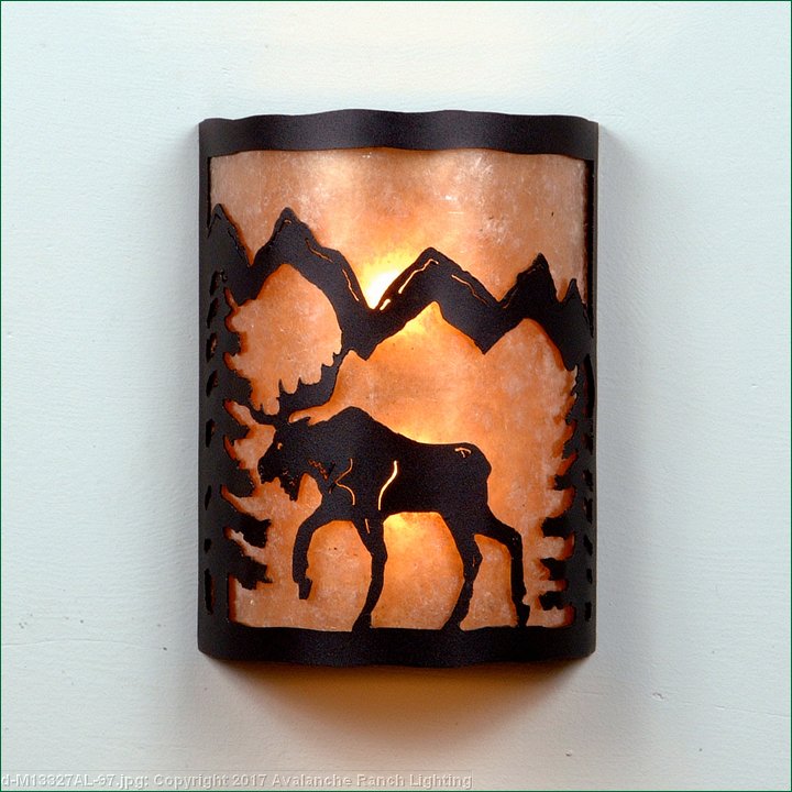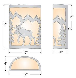 The Cascade Sconce Large - Mtn Moose features our exclusive metal art of a moose and spruce trees with a rounded mica under a steel frame. One lightbulb points upward and the other points downward. ADA compliant. Diffuser material is offered with a choice between Almond or Amber mica. Hardwire is standard. Interior and damp location only, however exterior version available under Product No. M51827. This light will add rustic character to any log home, cabin or northwoods lodge-themed room.