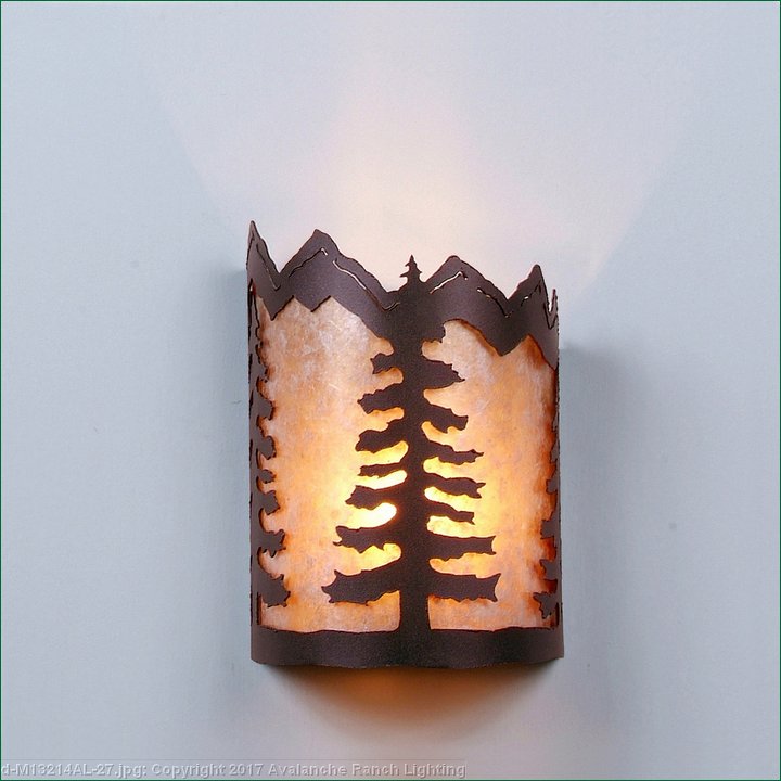 The Cascade Sconce Small - Spruce features our exclusive metal art of spruce trees with a rounded mica under a steel frame. One lightbulb points upward. ADA compliant. Diffuser material is offered with a choice between Almond or Amber mica. Hardwire is standard. Interior and damp location only. This rustic wall light will add rustic character to any log home, cabin or northwoods, camp lodge-themed room.