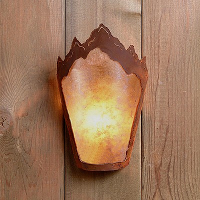 The Decatur Sconce - Rustic Plain features a diamond backplate with handcut designs. Diffuser material choice between Almond or Amber mica. This unique sconce is sure to bring artistic, rustic character and warm lighting to any log home, cabin or northwood lodge-themed room.