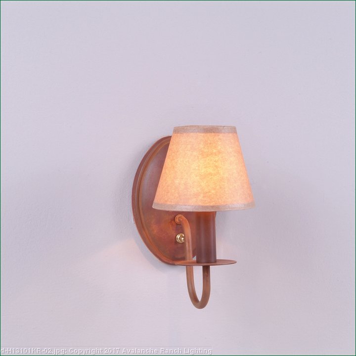 The Diablo Sconce - Rustic Plain features an oval backplate, an on/off switch located on the front of the fixture and a candelabra clip shade. Comes standard with a lampshade, Style #710-KR (3 x 5 x 4). This light is ideal for anyone looking to add warm, rustic lighting to their log home, cabin or northwood lodge-themed room.