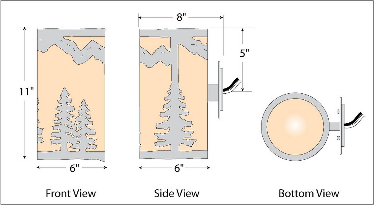 The Kincaid Sconce - Spruce Tree features our exclusive metal art of spruce trees with a rounded mica under a steel cylinder. One lightbulb points upward and the other points downward. This sconce sits off the wall by about 3 inches. Diffuser material is offered with a choice between Almond or Amber mica. Interior and damp location only. This rustic wall light will add rustic character to any log home, cabin or northwoods lodge-themed room.