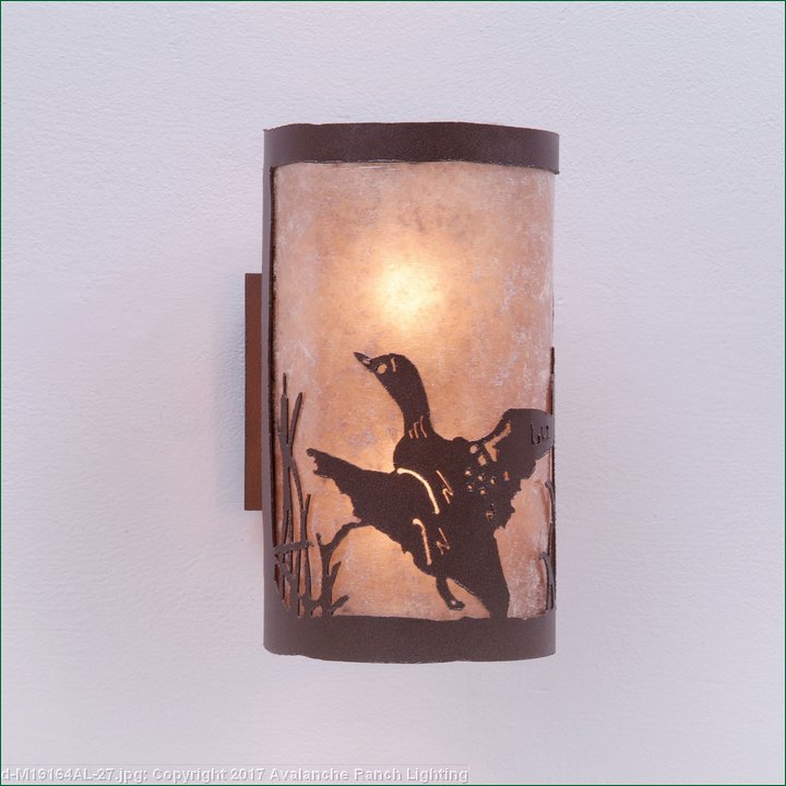 The Kincaid Sconce - Loon features our exclusive metal art of a loon and cattails with a rounded mica under a steel cylinder. One lightbulb points upward and the other points downward. This sconce sits off the wall by about 3 inches. Diffuser material is offered with a choice between Almond or Amber mica. Interior and damp location only. This light will add rustic character to any log home, cabin or northwoods lodge-themed room.