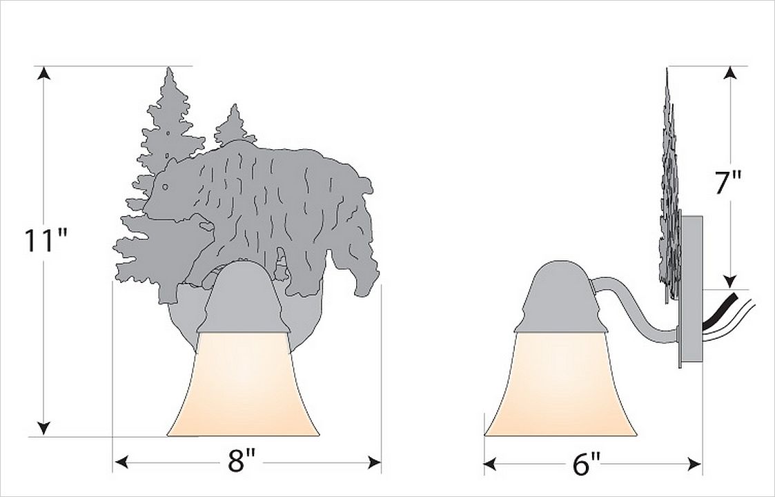 The Lakeside Single Sconce - Bear features our exclusive plasma-cut bear with hand cut interior lines standing next to our pine trees, all attached to a rustic steel disc with a single arm with light. There is a choice of six different glass globes, the smallest of which only takes A15 bulb. This rustic wall light compliments the lakeside bath lights will add warm lighting and rustic character to any room.