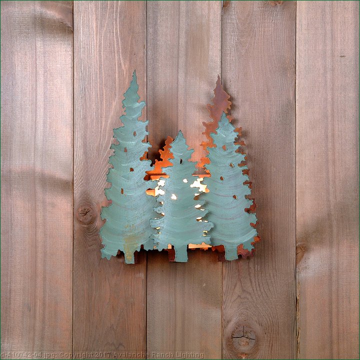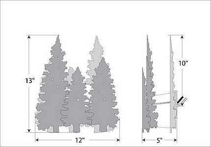 The Pine Grove sconce features our trademarked steel pine trees set in front and behind with the medium-based lamping between. This sconce is ideal for anyone looking to add rustic character or unique log home lighting to their home. The trees in the front are hand-painted over rust patina finish and trees with only our natural rust patina finish are behind. Covering the bulb is a frost clear glass diffuser, which shields the bulb from side viewing. Suitable for interior and damp locations only. For an exterior version of this light, see the exterior lights section.