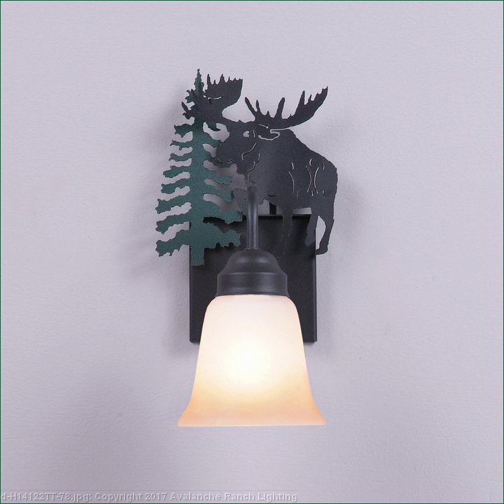 Our Wasatch Single Sconce series is one of most versatile light, as it is often used in the bathroom on either side of the vanity, in the family room on either side of the fireplace, or anywhere where you want a bright light. Offered with a choice of eight different styles and colors of glass globes, this rustic wall fixture is a great choice. This item is the Wasatch Single - Alaska Moose and is Pictured in Finish #03 - Cedar Green trees and Rust Patina base.