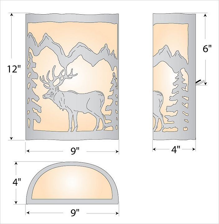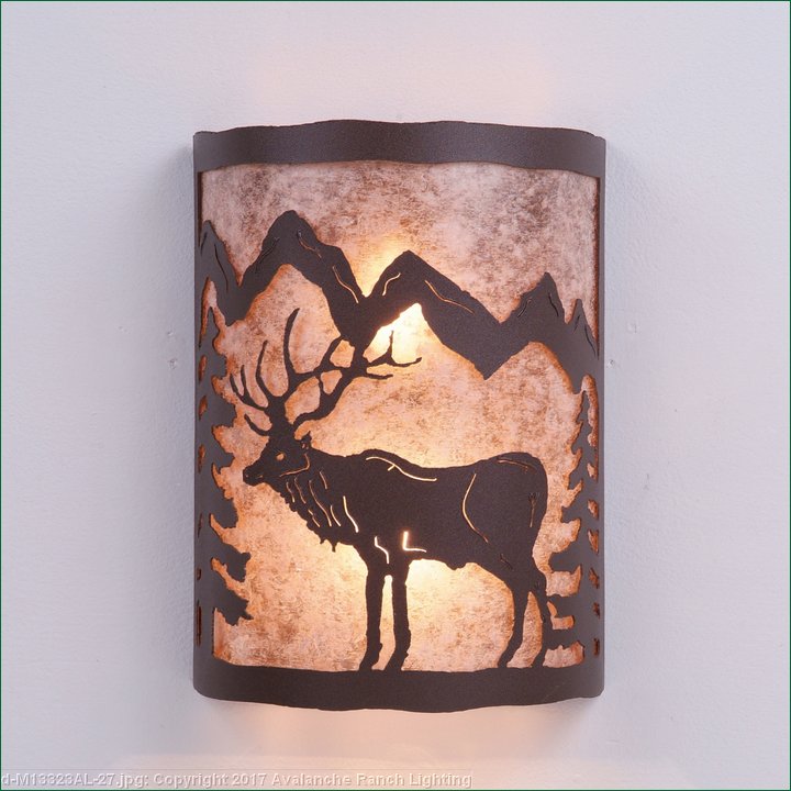 The Cascade Sconce Large - Mtn Elk features our exclusive metal art of an elk and spruce trees with a rounded mica under a steel frame. One lightbulb points upward and the other points downward. ADA compliant. Diffuser material is offered with a choice between Almond or Amber mica. Hardwire is standard. Interior and damp location only, however exterior version available under Product No. M51823. This light will add rustic character to any log home, cabin or northwoods lodge-themed room.