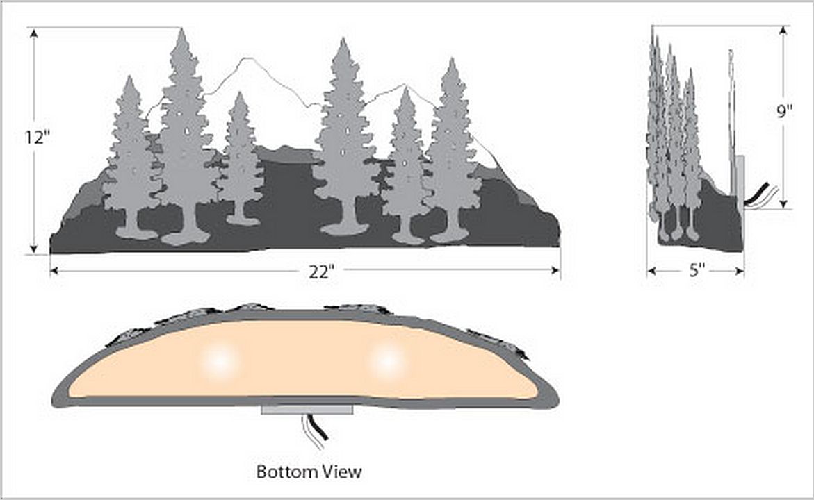 The Wood Mountain Sconce - Pine features a snowcapped mountains in the background with pine trees along the front. A mica shade shields the bulb from bottom viewing. This light is ideal for bringing rustic character to any log home, cabin or northwoods lodge-themed room.