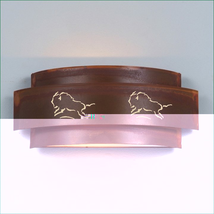 The Northridge Double Sconce - Bison features two bulbs positioned sideways under a steel frame with hand-cut bison images. It has a frost glass diffuser bottom and light projects both up and down. Synthetic mica is attached behind each image cutout. This light will bring rustic character to any log home, cabin or northwoods lodge-themed room.