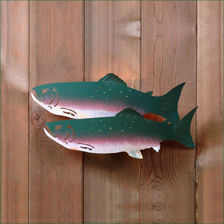 The Travelin Trout Sconce features our unique seven-step hand-painted finishing process. The painting technique and color adds a lifelike characteristic to the two fish, making the sconce both decorative and rustic. Behind the fish is a frost clear diffuser covering the socket to shield the bulb from side viewing. This sconce is ideal for anyone looking to bring unique rustic lighting to the walls of their log home, cabin or northwood lodge-themed room.
