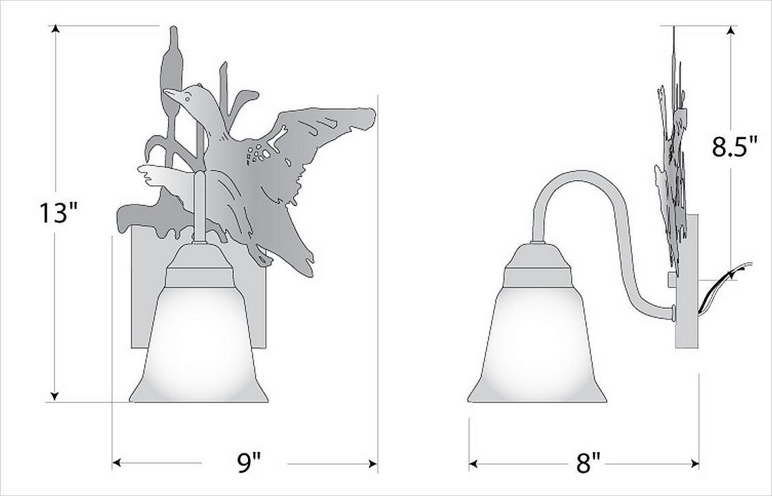 Our Wasatch Single Sconce series is one of most versatile light, as it is often used in the bathroom on either side of the vanity, in the family room on either side of the fireplace, or anywhere where you want a bright light. Offered with a choice of eight different styles and colors of glass globes, this rustic wall fixture is a great choice. This item is the Wasatch Single - Loon and is Pictured in Finish #03 - Cedar Green cattails and Rust Patina base.
