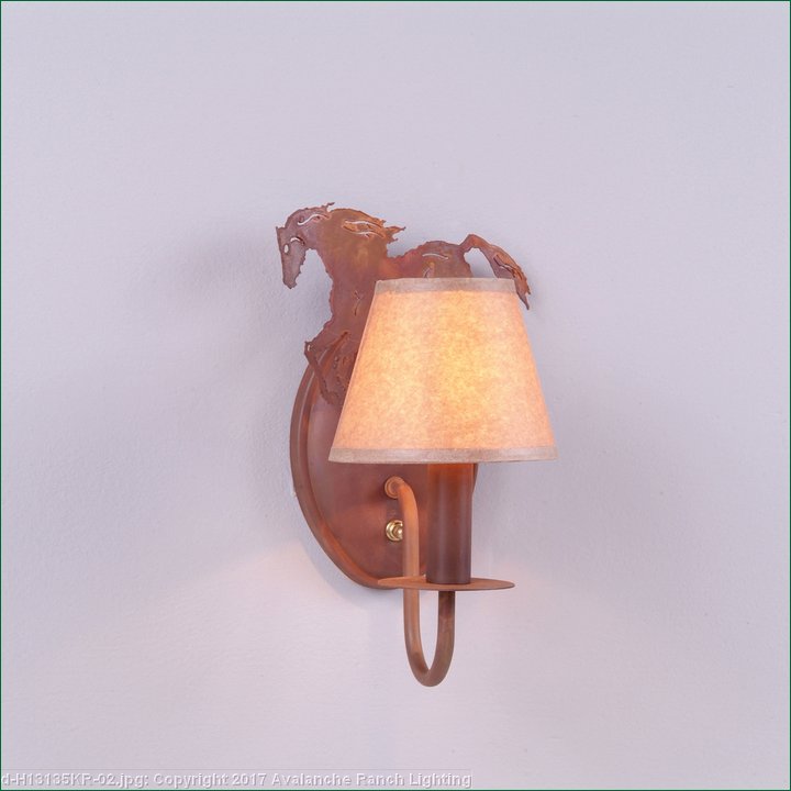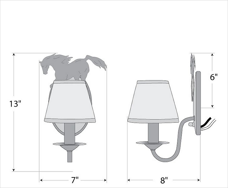 The Diablo Sconce - Mtn Horse features an oval backplate, an on/off switch located on the front of the fixture and a candelabra clip shade. Comes standard with a lampshade, Style #710-KR (3 x 5 x 4). This light is ideal for anyone looking to add warm, rustic lighting to their log home, cabin or northwood lodge-themed room.