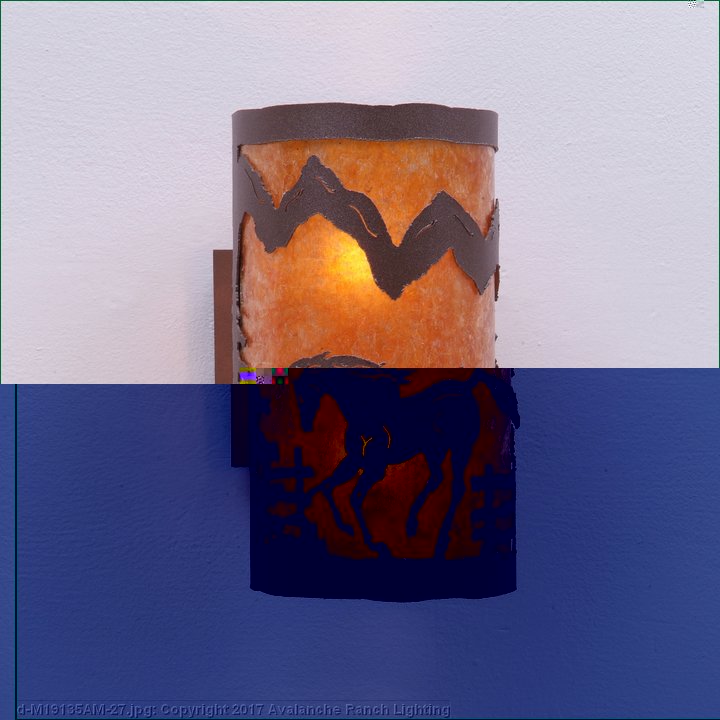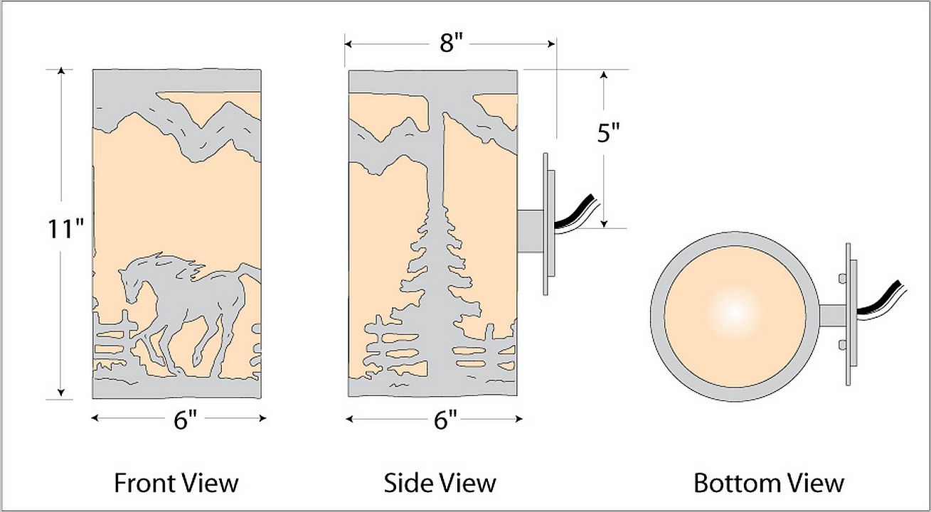The Kincaid Sconce - Mtn Horse features our exclusive metal art of a horse and spruce trees with a rounded mica under a steel cylinder. One lightbulb points upward and the other points downward. This sconce sits off the wall by about 3 inches. Diffuser material is offered with a choice between Almond or Amber mica. Interior and damp location only. This rustic western wall light will add rustic character to any log home, cabin or northwoods lodge-themed room.