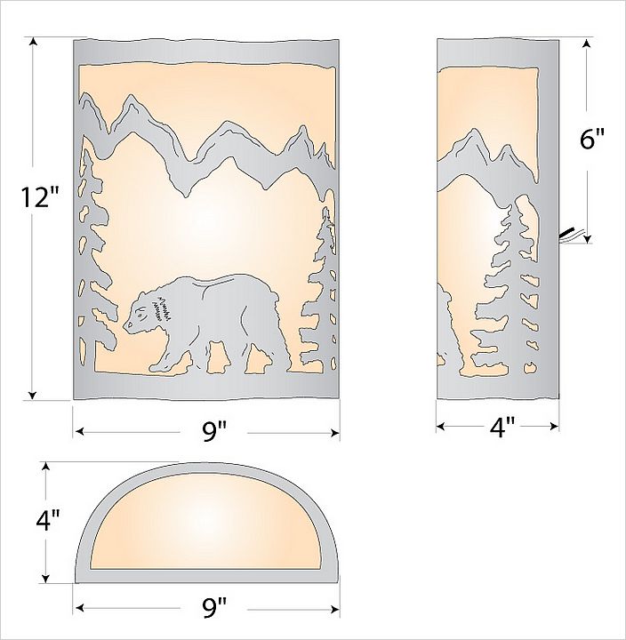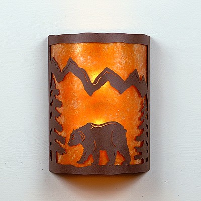 The Cascade Sconce Large - Mtn Bear features our exclusive metal art of a bear and spruce trees with a rounded mica under a steel frame. One lightbulb points upward and the other points downward. ADA compliant. Diffuser material is offered with a choice between Almond or Amber mica. Hardwire is standard. Interior and damp location only, however exterior version available under Product No. M51825. This light will add rustic character to any log home, cabin or northwoods lodge-themed room.