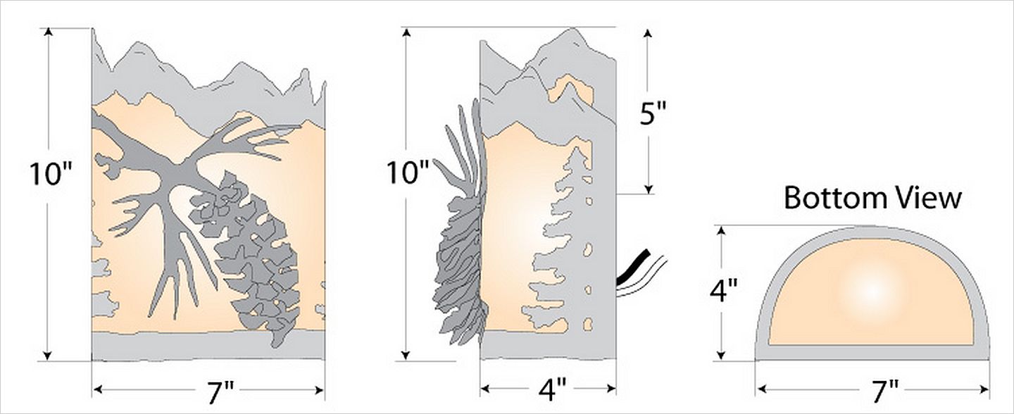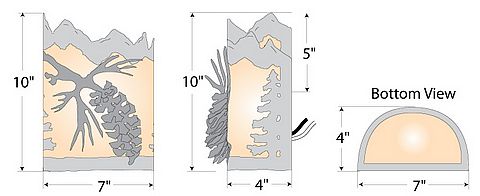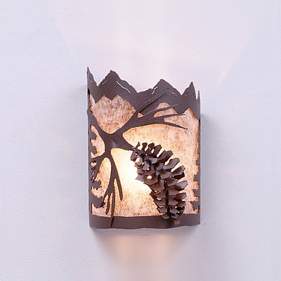 The Cascade Sconce Small - Srpuce Cone features our exclusive metal art of an three dimensional spruce cone and spruce trees with a rounded mica under a steel frame. One lightbulb points upward. ADA compliant. Diffuser material is offered with a choice between Almond or Amber mica. Hardwire is standard. Interior and damp location only. This light will add rustic character to any log home, cabin or northwoods lodge-themed room.