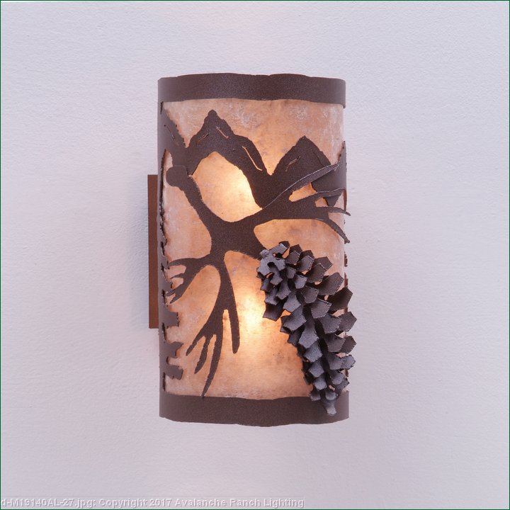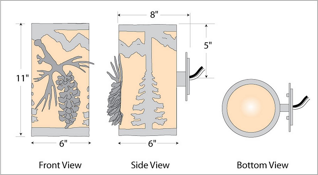 The Kincaid Sconce - Spruce Cone features our exclusive 3 dimensional spruce cone metal art and spruce trees with a rounded mica under a steel cylinder. One lightbulb points upward and the other points downward. This sconce sits off the wall by about 3 inches. Diffuser material is offered with a choice between Almond or Amber mica. Interior and damp location only. This light will add rustic character to any log home, cabin or northwoods lodge-themed room.