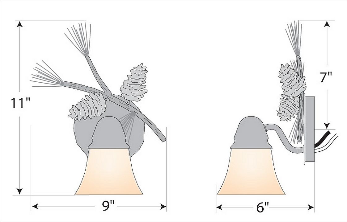 The Lakeside Single Sconce - Pine Cone features our exclusive handmade steel pine cones with realistic needles on a steel textured branch, all attached to a rustic steel disc with a single arm with light. There is a choice of six different glass globes, the smallest of which only takes A15 bulb. This rustic wall light compliments the lakeside bath lights will add warm lighting and rustic character to any room.