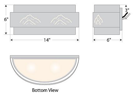 The Northridge Double Sconce - Mountain features two bulbs positioned sideways under a steel frame with a hand-cut mountain image in the center band. It has a frost glass diffuser bottom and light projects both up and down. Synthetic mica is attached behind each image cutout to help diffuse the light. This Southwest-inspired sconce is really great for the hallways and will provide a warm accent to the walls of your home.
