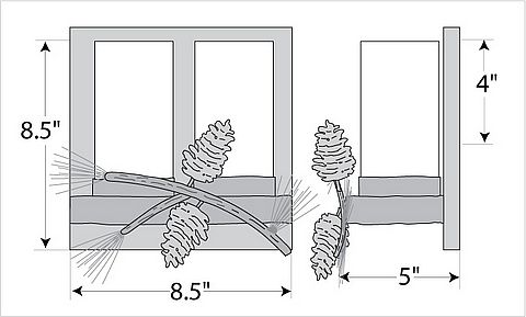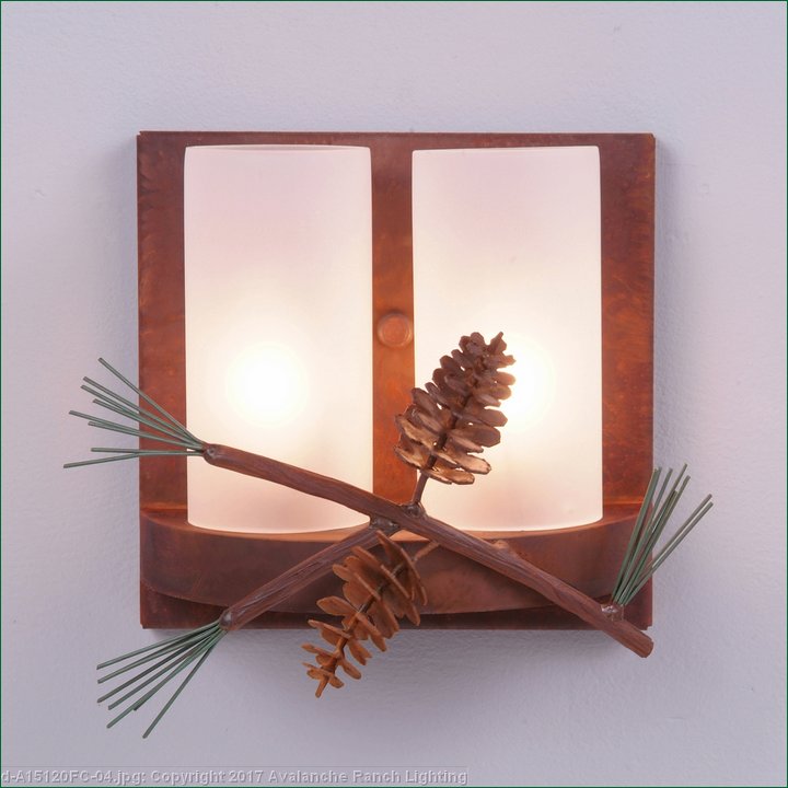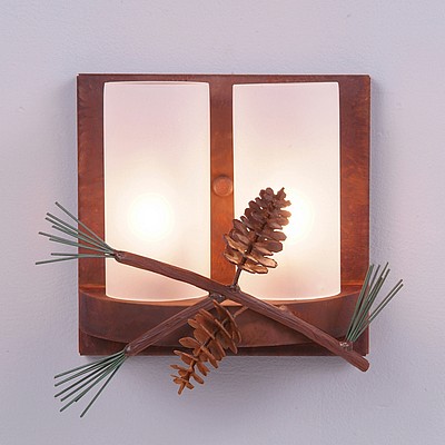 The Wisley Double Sconce Pine Cone features hand-made steel pine cones with pine needles on a lifelike metal branch. This metal art is placed in front of two 6 inch high by 3 inch diameter cylinder glass covering a candelabra bulb. The glass is available in either frost clear or tea stain. This sconce is ideal for anyone looking to incorporate stylish rustic contemporary lighting in their log home, cabin or northwood lodge-themed room and the pine cones are pretty cool, too!.