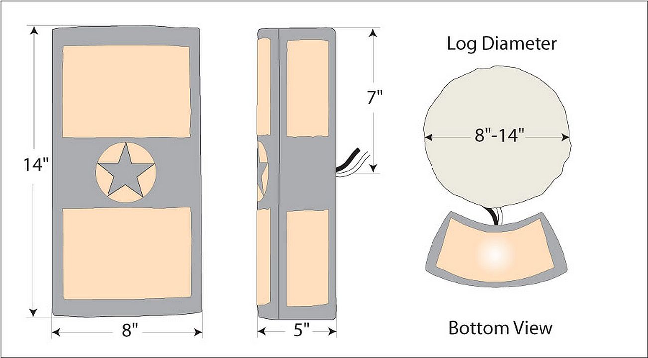 The Benton Sconce - Texas Star is a uniquely shaped fixture can be mounted to both a flat wall and a log pole with an 8 to 14 inch diameter. This southwest styled light features the texas star cutout in the center band. Bulbs point upwards and downwards. Diffuser material is offered with a choice between Almond or Amber mica. This rustic wall sconce was especially designed for the log home owner, and will bring warm lighting and rustic character to any log home, cabin or northwoods lodge-themed room.
