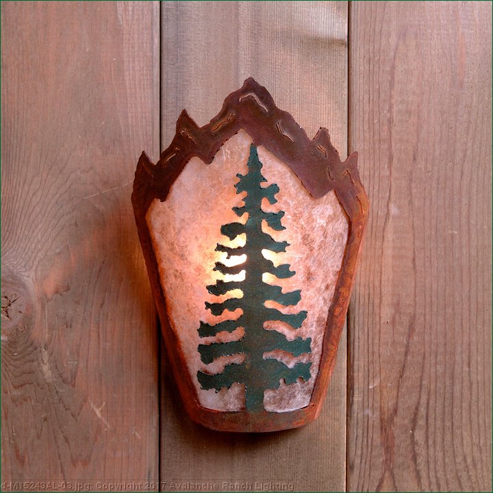 The Decatur Sconce - Cedar Tree features a single cedar tree image set on a diamond backplate with diffuser material choice of Almond or Amber mica. This unique sconce is sure to bring artistic, rustic character and warm lighting to any log home, cabin or northwood lodge-themed room.