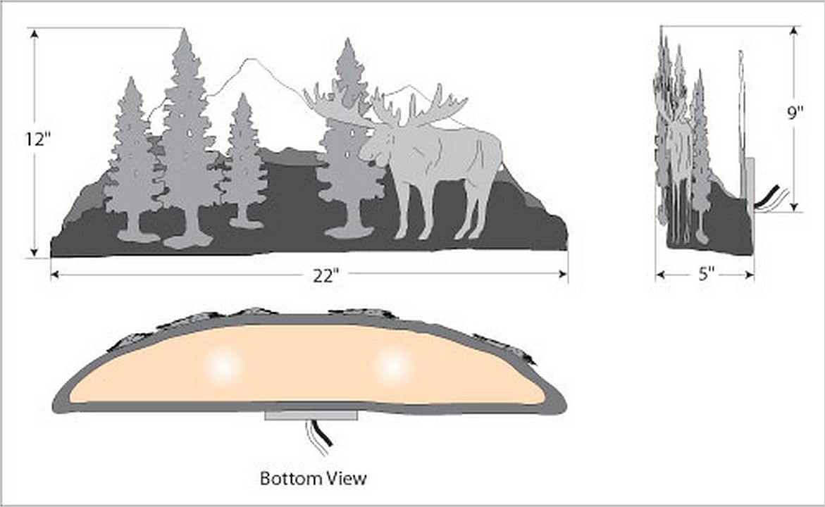 The Wood Mountain Sconce - Moose features a snowcapped mountains in the background with trees and a moose image along the front. A mica shade shields the bulb from bottom viewing. This light is ideal for bringing a touch of wildlife to any log home, cabin or northwoods lodge-themed room.