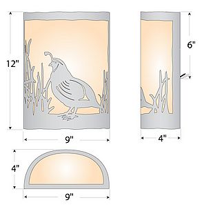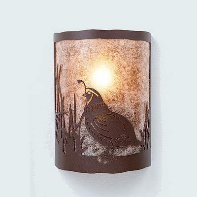 The Cascade Sconce Large - Quail features our exclusive metal art of a quail and cattails with a rounded mica under a steel frame. One lightbulb points upward and the other points downward. ADA compliant. Diffuser material is offered with a choice between Almond or Amber mica. Hardwire is standard. Interior and damp location only, however exterior version available under Product No. M51854. This light will add rustic character to any log home, cabin or northwoods lodge-themed room.