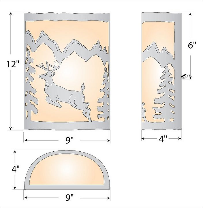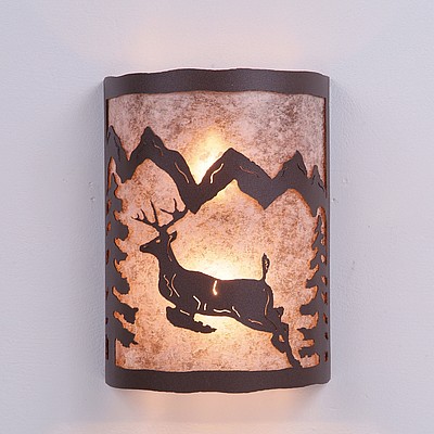 The Cascade Sconce Large - Valley Deer features our exclusive metal art of a deer and spruce trees with a rounded mica under a steel frame. One lightbulb points upward and the other points downward. ADA compliant. Diffuser material is offered with a choice between Almond or Amber mica. Hardwire is standard. Interior and damp location only, however exterior version available under Product No. M51821. This light will add rustic character to any log home, cabin or northwoods lodge-themed room.