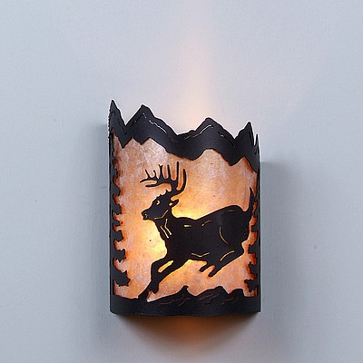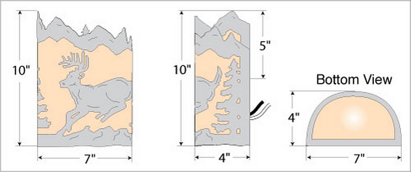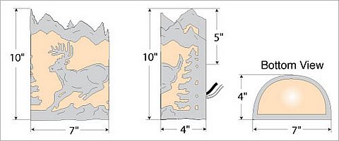 The Cascade Sconce Small - Mtn Deer features our exclusive metal art of a deer and spruce trees with a rounded mica under a steel frame. One lightbulb points upward. ADA compliant. Diffuser material is offered with a choice between Almond or Amber mica. Hardwire is standard. Interior and damp location only. This light will add rustic character to any log home, cabin or northwoods lodge-themed room.