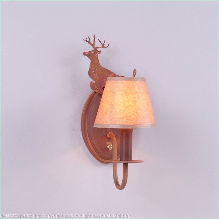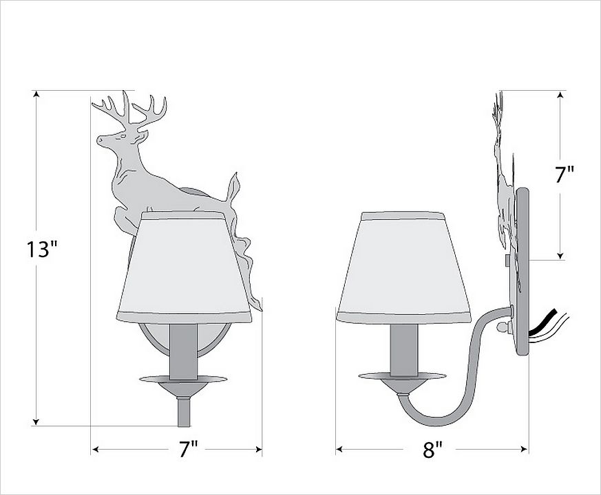 The Diablo Sconce - Valley Deer features an oval backplate, an on/off switch located on the front of the fixture and a candelabra clip shade. Comes standard with a lampshade, Style #710-KR (3 x 5 x 4). This light is ideal for anyone looking to add warm, rustic lighting to their log home, cabin or northwood lodge-themed room.