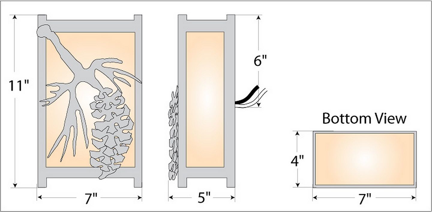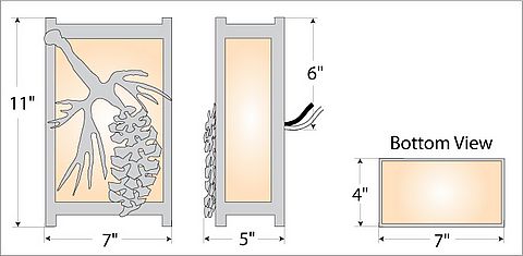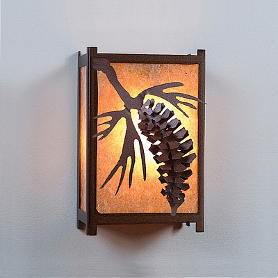 The Seneca Large Sconce - Spruce Cone features mica panels on three sides with a very life like 3 dimensional spruce cone image on the front panel. Diffuser material is offered with a choice between Almond or Amber mica. This light will add rustic character to any log home, cabin or northwoods lodge-themed room. The one is not ADA compliant. Formerly known as the Severn Sconce. Interior and damp location only.