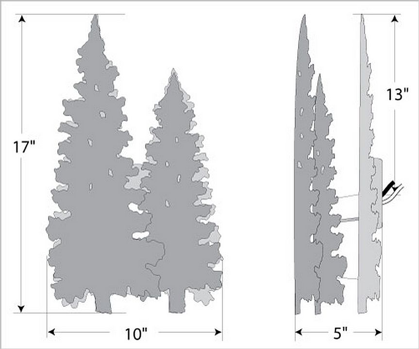 The Twin Pine sconce features two of our trademarked steel pine trees set in front and behind with the medium-based lamping between. This sconce is ideal for anyone looking to add rustic character or unique log home lighting to their home. The trees in the front are hand-painted over rust patina finish and trees with only our natural rust patina finish are behind. Covering the bulb is a frost clear glass diffuser, which shields the bulb from side viewing. Suitable for interior and damp locations only. For an exterior version of this light, see the exterior lights section.