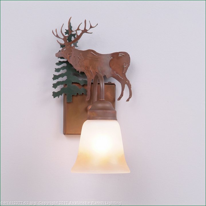Our Wasatch Single Sconce series is one of most versatile light, as it is often used in the bathroom on either side of the vanity, in the family room on either side of the fireplace, or anywhere where you want a bright light. Offered with a choice of eight different styles and colors of glass globes, this rustic wall fixture is a great choice. This item is the Wasatch Single - Valley Elk and is Pictured in Finish #03 - Cedar Green trees and Rust Patina base.