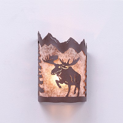 The Cascade Sconce Small - Alaska Moose features our exclusive metal art of a moose and spruce trees with a rounded mica under a steel frame. One lightbulb points upward. ADA compliant. Diffuser material is offered with a choice between Almond or Amber mica. Hardwire is standard. Interior and damp location only. This rustic wall light will add rustic character to any log home, cabin or northwoods, camp lodge-themed room.