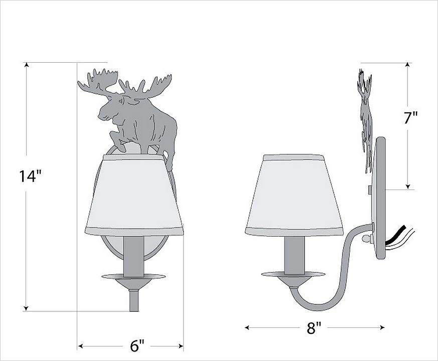The Diablo Sconce - Alaska Moose features an oval backplate, an on/off switch located on the front of the fixture and a candelabra clip shade. Comes standard with a lampshade, Style #710-KR (3 x 5 x 4). This light is ideal for anyone looking to add warm, rustic lighting to their log home, cabin or northwood lodge-themed room.