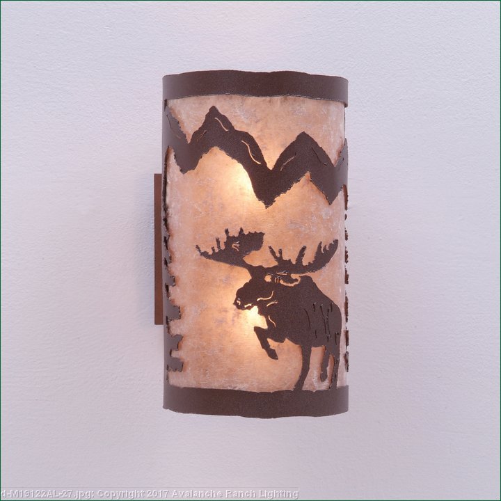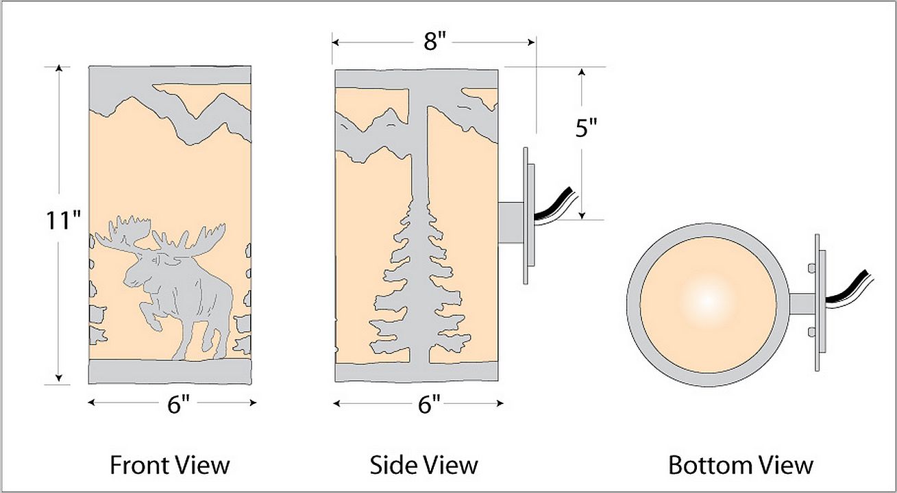 The Kincaid Sconce - Alaska Moose features our exclusive metal art of a moose and spruce trees with a rounded mica under a steel cylinder. One lightbulb points upward and the other points downward. This sconce sits off the wall by about 3 inches. Diffuser material is offered with a choice between Almond or Amber mica. Interior and damp location only. This rustic wall light will add rustic character to any log home, cabin or northwoods lodge-themed room.
