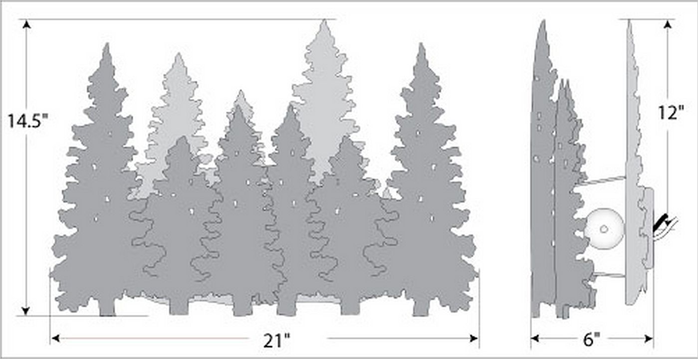 The Pine Forest sconce features our trademarked steel pine trees set in front and behind with the medium-based lamping between. This sconce is ideal for anyone looking to add rustic character or unique log home lighting to their home. The trees in the front are hand-painted over rust patina finish and trees with only our natural rust patina finish are behind. Covering the bulb is a frost clear glass diffuser, which shields the bulb from side viewing. Suitable for interior and damp locations only.