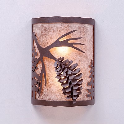 The Cascade Sconce Large - Spruce Conde features our exclusive metal art of a three dimensional spruce cone and trees with a rounded mica under a steel frame. One lightbulb points upward and the other points downward. ADA compliant. Diffuser material is offered with a choice between Almond or Amber mica. Hardwire is standard. Interior and damp location only, however exterior version available under Product No. M51840. This light will add rustic character to any log home, cabin or northwoods lodge-themed room.