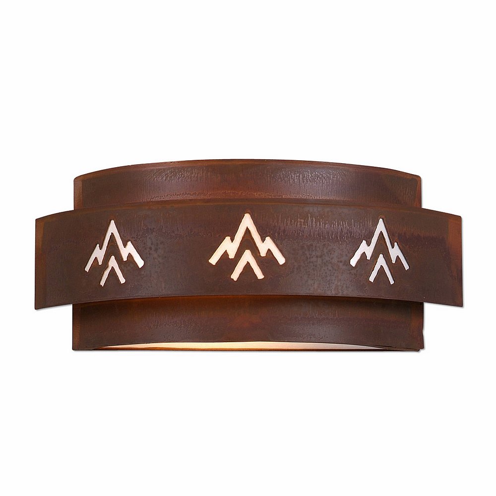 The Northridge Double Sconce - Deception Pass features two bulbs positioned sideways under a steel frame with hand-cut mountain images in the center band. It has a frost glass diffuser bottom and light projects both up and down. Synthetic mica is attached behind each image cutout. This Southwest-inspired sconce will provide unique rustic lighting to the walls of any log home, cabin or northwood lodge-themed room.