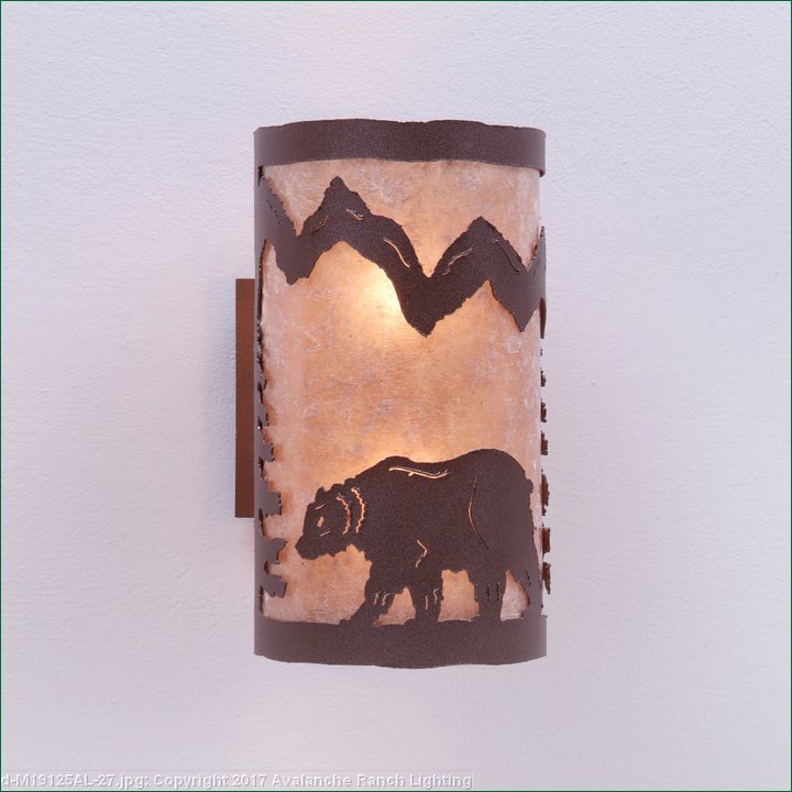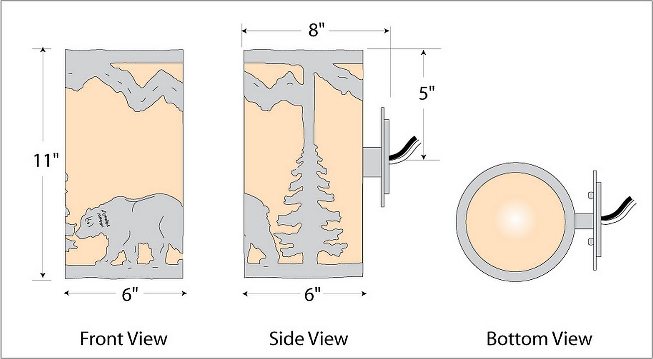 The Kincaid Sconce - Mtn Bear features our exclusive metal art of a bear and spruce trees with a rounded mica under a steel cylinder. One lightbulb points upward and the other points downward. This sconce sits off the wall by about 3 inches. Diffuser material is offered with a choice between Almond or Amber mica. Interior and damp location only. This rustic wall light will add rustic character to any log home, cabin or northwoods lodge-themed room.