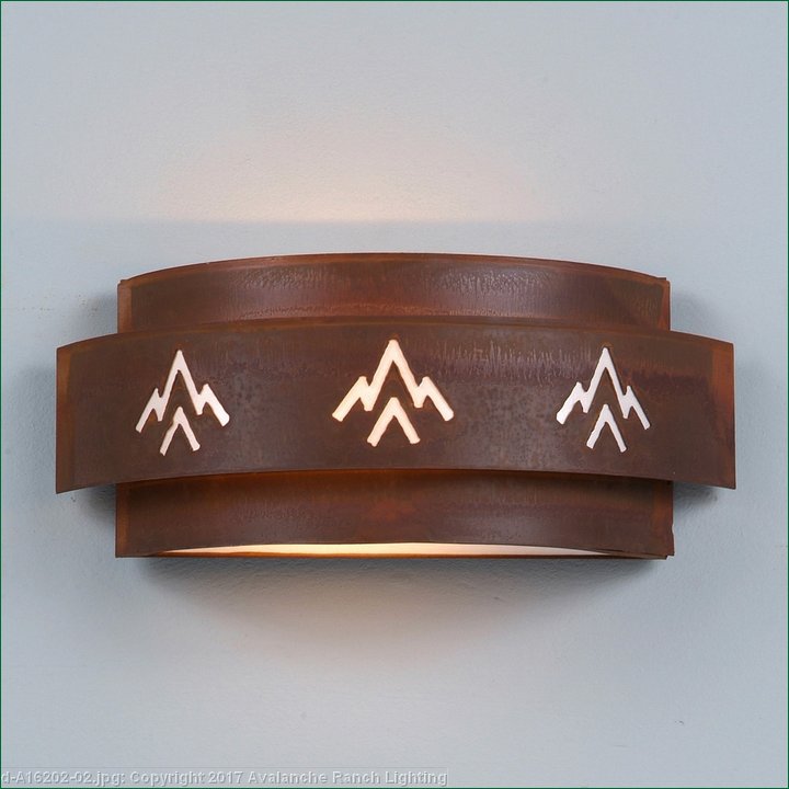The Northridge Double Sconce - Deception Pass features two bulbs positioned sideways under a steel frame with hand-cut mountain images in the center band. It has a frost glass diffuser bottom and light projects both up and down. Synthetic mica is attached behind each image cutout. This Southwest-inspired sconce will provide unique rustic lighting to the walls of any log home, cabin or northwood lodge-themed room.