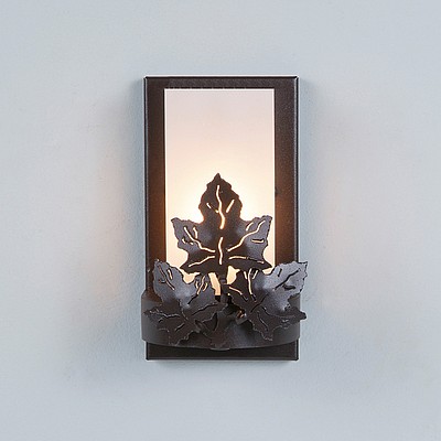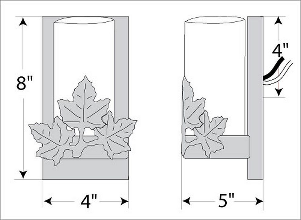 The Wisley Single Sconce Maple features hand-cut maple leaves placed in front of a 5 inch high by 3 inch diameter cylinder glass covering a candelabra bulb. The glass is available in either frost clear or tea stain. Named after an English garden, this sconce is ideal for anyone looking to incorporate stylish rustic contemporary lighting in their log home, cabin or northwood lodge-themed room. ADA compliant.