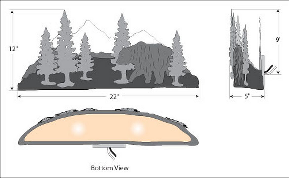 The Wood Mountain Sconce - Bear features a snowcapped mountains in the background with trees and a bear image along the front. A mica shade shields the bulb from bottom viewing. This light is ideal for bringing a touch of wildlife to any log home, cabin or northwoods lodge-themed room.