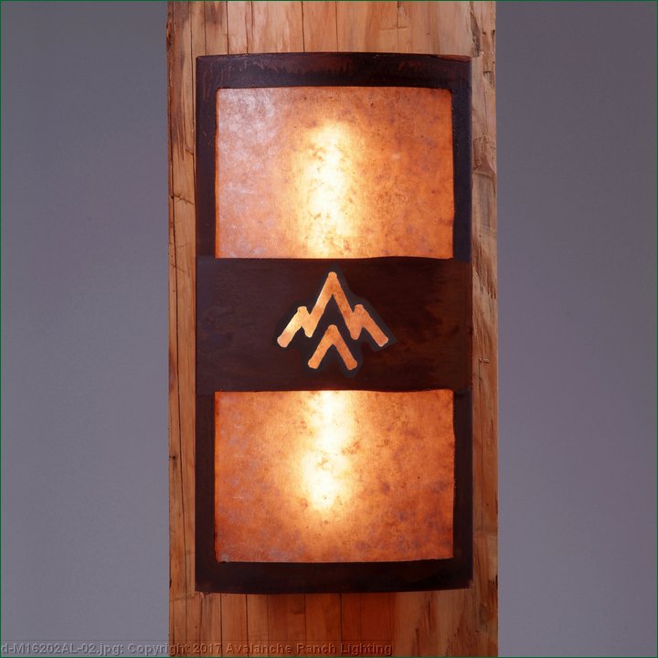 The Benton Sconce - Deception Pass is a uniquely shaped fixture can be mounted to both a flat wall and a log pole with an 8 to 14 inch diameter. This southwest styled light features our exclusive metal art cutout in the center band. Bulbs point upwards and downwards. Diffuser material is offered with a choice between Almond or Amber mica. This rustic wall sconce was especially designed for the log home owner, and will bring warm lighting and rustic character to any log home, cabin or northwoods lodge-themed room.