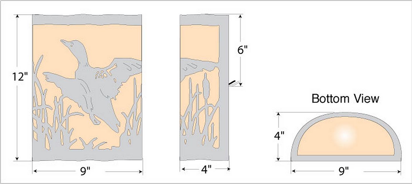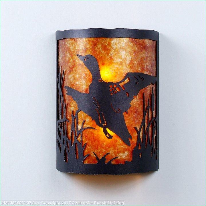 The Cascade Sconce Large - Loon features our exclusive metal art of a loon and cattails with rounded mica under a steel frame. One lightbulb points upward and the other points downward. ADA compliant. Diffuser material is offered with a choice between Almond or Amber mica. Hardwire is standard. Interior and damp location only, however exterior version available under Product No. M51864. This light will add rustic character to any log home, cabin or northwoods lodge-themed room.